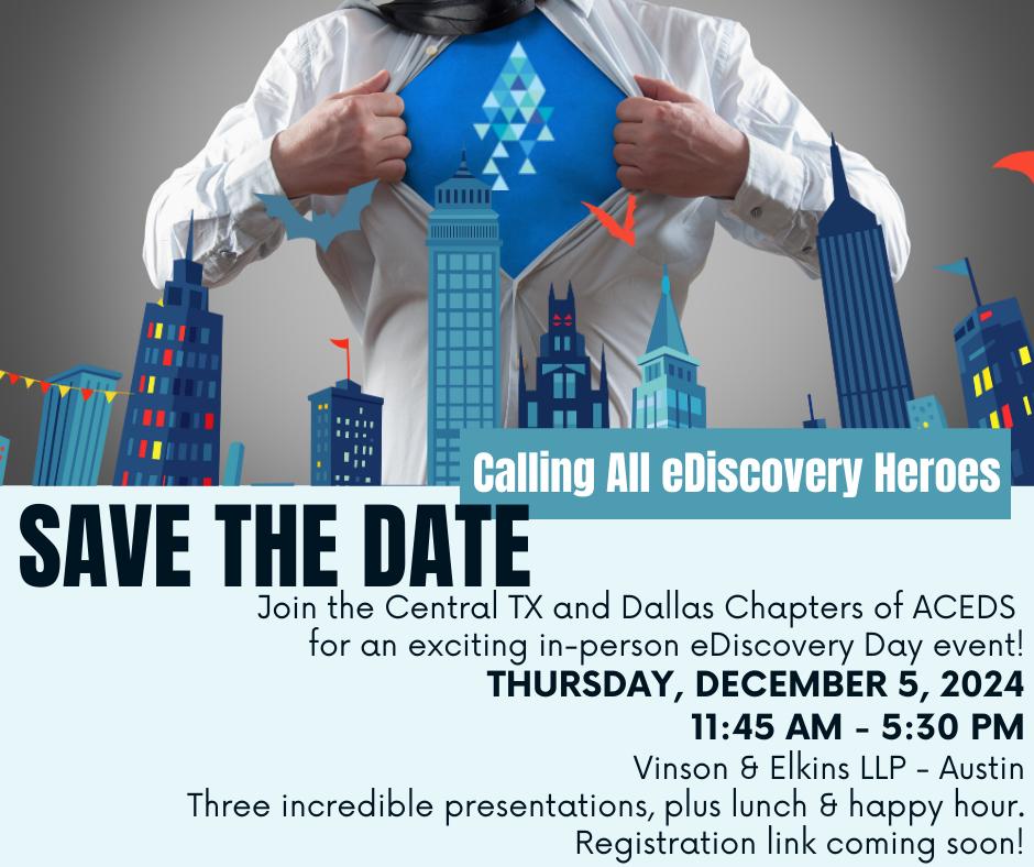 Vinson & Elkins LLP; Indeed Tower - 200 West 6th Street, Austin, Texas 200 West 6th Street #suite 2500, Austin, TX 78701, Austin, TX, USGet ready to dive deep into the world of eDiscovery at Texas Together: 2025 Annual eDiscovery DayJoin us for an afternoon of connection, conversation, and forward-thinking dialogue across the ACEDS Texas Chapters. The day kicks off with a local lunch and opening remarks, followed by a Judges’ Panel exploring key perspectives in today’s evolving legal […]